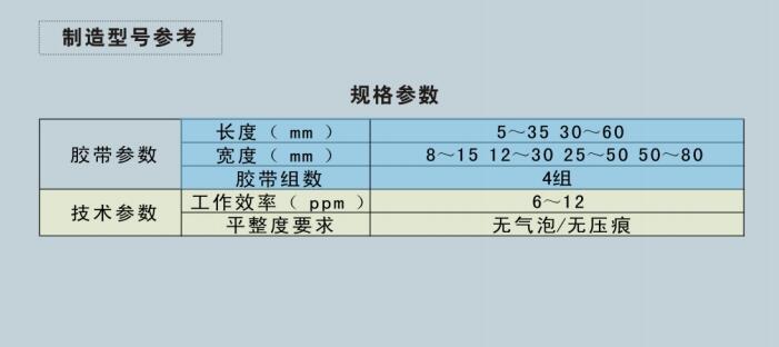 性能特点:1.包胶不起皱、无气泡;2.根据电芯的大小可调胶带的宽度、长度;3.操作简单。产品使用领域:电芯外部包胶工序