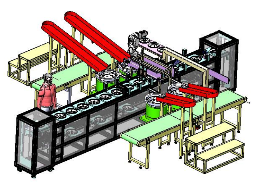 输送方式:输送倍速链当输送载体,在链条上放置治具进行装载产品,在每个工位制作二次定位机构,对治具进行二次定位,提高设备精度。 上料区包含8个工位,分别为人工上料工位,CCD对比工位,旋转对位工位,自动上螺栓工位,螺栓检测工位,排不良工位,机械手取料工位和1个预留工位。在针对螺栓振动盘补料时增加4个滑槽,配备脚踏阶梯,由人工直接将螺钉倒放到振动盘内。
