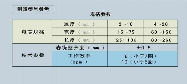 性能特点:1.实现极片/隔膜卷料生产、自动卷绕、自动贴终止胶带、自动卸料、平压、自动测短路;2.应用三工位转盘式生产。实现一位卷绕、一位贴胶、一位卸料;3.极片隔膜都具有主动的全程纠偏功能;4.具有恒转速/变转速,追动张力/变张力控制极片和隔膜的功能;5.具有检测正/负极片来料不良标签并自动单卷剔除功能;在卷绕的过程中实现刷粉、除尘、吸走杂质的功能。产品使用领域:方型锂电池的卷绕工序